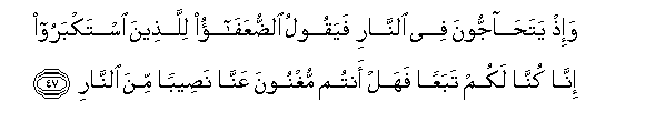 47. Wa-ith yatahajjoona fee alnnari fayaqoolu aldduAAafao lillatheena istakbaroo inna kunna lakum tabaAAan fahal antum mughnoona AAanna naseeban mina alnnari