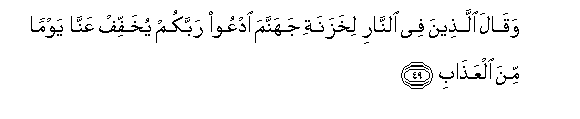 49. Waqala allatheena fee alnnari likhazanati jahannama odAAoo rabbakum yukhaffif AAanna yawman mina alAAathabi