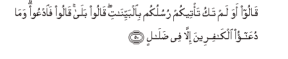 50. Qaloo awa lam taku ta/teekum rusulukum bialbayyinati qaloo bala qaloo faodAAoo wama duAAao alkafireena illa fee dalalin