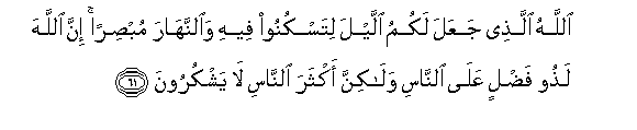 61. Allahu allathee jaAAala lakumu allayla litaskunoo feehi waalnnahara mubsiran inna Allaha lathoo fadlin AAala alnnasi walakinna akthara alnnasi la yashkuroona