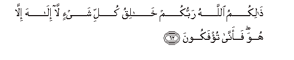 62. Thalikumu Allahu rabbukum khaliqu kulli shay-in la ilaha illa huwa faanna tu/fakoona