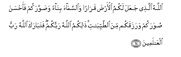 64. Allahu allathee jaAAala lakumu al-arda qararan waalssamaa binaan wasawwarakum faahsana suwarakum warazaqakum mina alttayyibati thalikumu Allahu rabbukum fatabaraka Allahu rabbu alAAalameena