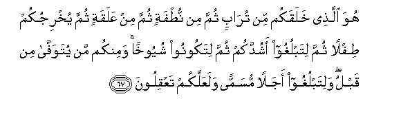 67. Huwa allathee khalaqakum min turabin thumma min nutfatin thumma min AAalaqatin thumma yukhrijukum tiflan thumma litablughoo ashuddakum thumma litakoonoo shuyookhan waminkum man yutawaffa min qablu walitablughoo ajalan musamman walaAAallakum taAAqiloona