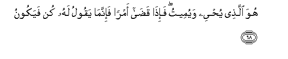68. Huwa allathee yuhyee wayumeetu fa-itha qada amran fa-innama yaqoolu lahu kun fayakoonu