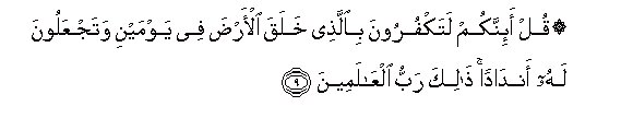 9. Qul a-innakum latakfuroona biallathee khalaqa al-arda fee yawmayni watajAAaloona lahu andadan thalika rabbu alAAalameena