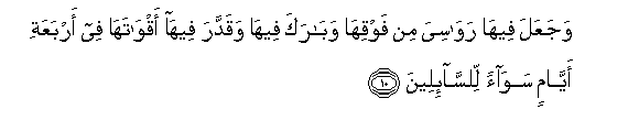 10. WajaAAala feeha rawasiya min fawqiha wabaraka feeha waqaddara feeha aqwataha fee arbaAAati ayyamin sawaan lilssa-ileena