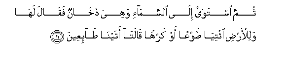 11. Thumma istawa ila alssama-i wahiya dukhanun faqala laha walil-ardi i/tiya tawAAan aw karhan qalata atayna ta-iAAeena