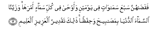 12. Faqadahunna sabAAa samawatin fee yawmayni waawha fee kulli sama-in amraha wazayyanna alssamaa alddunya bimasabeeha wahifthan thalika taqdeeru alAAazeezi alAAaleemi