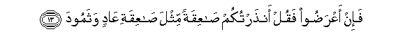 13. But if they turn away, say thou: "I have warned you of a stunning Punishment (as of thunder and lightning) like that which (overtook) the 'Ad and the Thamud!"