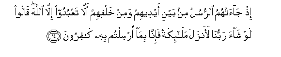 14. Ith jaat-humu alrrusulu min bayni aydeehim wamin khalfihim alla taAAbudoo illa Allaha qaloo law shaa rabbuna laanzala mala-ikatan fa-inna bima orsiltum bihi kafiroona
