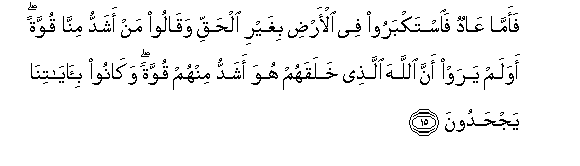 15. Faamma AAadun faistakbaroo fee al-ardi bighayri alhaqqi waqaloo man ashaddu minna quwwatan awa lam yaraw anna Allaha allathee khalaqahum huwa ashaddu minhum quwwatan wakanoo bi-ayatina yajhadoona