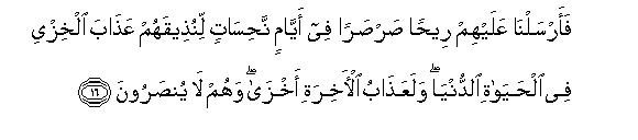 16. Faarsalna AAalayhim reehan sarsaran fee ayyamin nahisatin linutheeqahum AAathaba alkhizyi fee alhayati alddunya walaAAathabu al-akhirati akhza wahum la yunsaroona