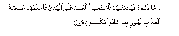17. Waamma thamoodu fahadaynahum faistahabboo alAAama AAala alhuda faakhathat-hum saAAiqatu alAAathabi alhooni bima kanoo yaksiboona