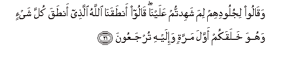 21. Waqaloo lijuloodihim lima shahidtum AAalayna qaloo antaqana Allahu allathee antaqa kulla shay-in wahuwa khalaqakum awwala marratin wa-ilayhi turjaAAoona