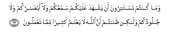 22. Wama kuntum tastatiroona an yashhada AAalaykum samAAukum wala absarukum wala juloodukum walakin thanantum anna Allaha la yaAAlamu katheeran mimma taAAmaloona