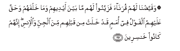 25. Waqayyadna lahum quranaa fazayyanoo lahum ma bayna aydeehim wama khalfahum wahaqqa AAalayhimu alqawlu fee omamin qad khalat min qablihim mina aljinni waal-insi innahum kanoo khasireena