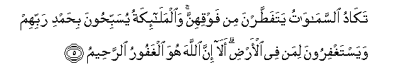 5. Takadu alssamawatu yatafattarna min fawqihinna waalmala-ikatu yusabbihoona bihamdi rabbihim wayastaghfiroona liman fee al-ardi ala inna Allaha huwa alghafooru alrraheemu