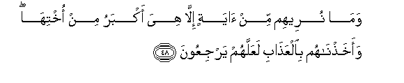 48. Wama nureehim min ayatin illa hiya akbaru min okhtiha waakhathnahum bialAAathabi laAAallahum yarjiAAoona
