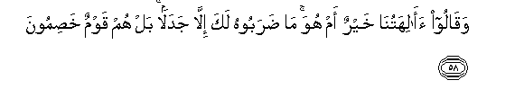 58. Waqaloo aalihatuna khayrun am huwa ma daraboohu laka illa jadalan bal hum qawmun khasimoona