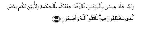 63. Walamma jaa AAeesa bialbayyinati qala qad ji/tukum bialhikmati wali-obayyina lakum baAAda allathee takhtalifoona feehi faittaqoo Allaha waateeAAooni