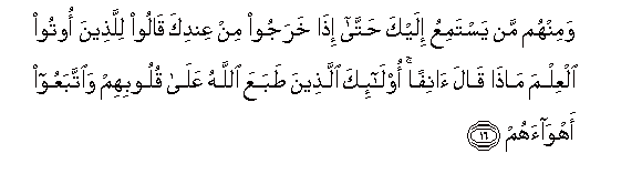 16. And among them are men who listen to thee, but in the end, when they go out from thee, they say to those who have received Knowledge, "What is it he said just then?" Such are men whose hearts Allah has sealed, and who follow their own lusts.