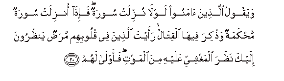 20. Wayaqoolu allatheena amanoo lawla nuzzilat sooratun fa-itha onzilat sooratun muhkamatun wathukira feeha alqitalu raayta allatheena fee quloobihim maradun yanthuroona ilayka nathara almaghshiyyi AAalayhi mina almawti faawla lahum