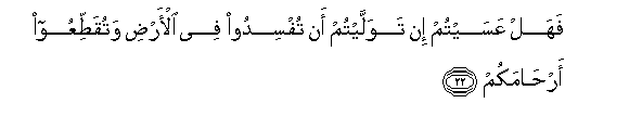 22. Fahal AAasaytum in tawallaytum an tufsidoo fee al-ardi watuqattiAAoo arhamakum