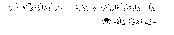 25. Inna allatheena irtaddoo AAala adbarihim min baAAdi ma tabayyana lahumu alhuda alshshaytanu sawwala lahum waamla lahum