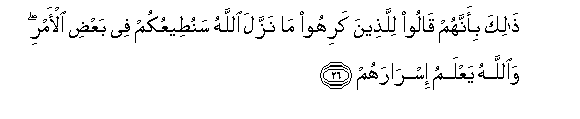 26. Thalika bi-annahum qaloo lillatheena karihoo ma nazzala Allahu sanuteeAAukum fee baAAdi al-amri waAllahu yaAAlamu israrahum