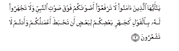 2. Ya ayyuha allatheena amanoo la tarfaAAoo aswatakum fawqa sawti alnnabiyyi wala tajharoo lahu bialqawli kajahri baAAdikum libaAAdin an tahbata aAAmalukum waantum la tashAAuroona