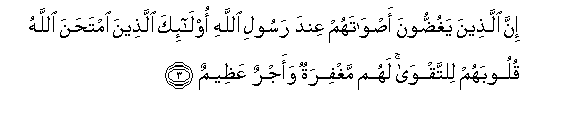 3. Inna allatheena yaghuddoona aswatahum AAinda rasooli Allahi ola-ika allatheena imtahana Allahu quloobahum lilttaqwa lahum maghfiratun waajrun AAatheemun
