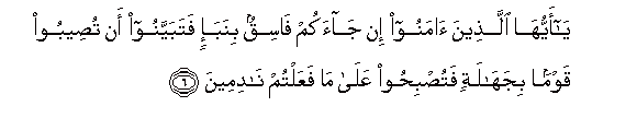 6. Ya ayyuha allatheena amanoo in jaakum fasiqun binaba-in fatabayyanoo an tuseeboo qawman bijahalatin fatusbihoo AAala ma faAAaltum nadimeena