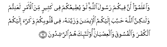 7. And know that among you is Allah.s Messenger. were he, in many matters, to follow your (wishes), ye would certainly fall into misfortune: But Allah has endeared the Faith to you, and has made it beautiful in your hearts, and He has made hateful to you Unbelief, wickedness, and rebellion: such indeed are those who walk in righteousness;-