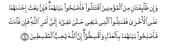 9. Wa-in ta-ifatani mina almu/mineena iqtataloo faaslihoo baynahuma fa-in baghat ihdahuma AAala al-okhra faqatiloo allatee tabghee hatta tafee-a ila amri Allahi fa-in faat faaslihoo baynahuma bialAAadli waaqsitoo inna Allaha yuhibbu almuqsiteena