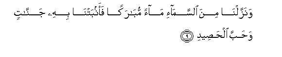 9. Wanazzalna mina alssama-i maan mubarakan faanbatna bihi jannatin wahabba alhaseedi