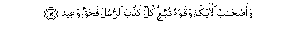 14. Waas-habu al-aykati waqawmu tubbaAAin kullun kaththaba alrrusula fahaqqa waAAeedi