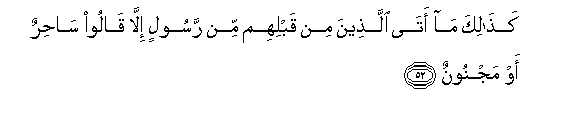 52. Similarly, no apostle came to the Peoples before them, but they said (of him) in like manner, "A sorcerer, or one possessed"!