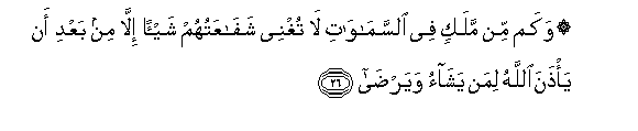 26. Wakam min malakin fee alssamawati la tughnee shafaAAatuhum shay-an illa min baAAdi an ya/thana Allahu liman yashao wayarda