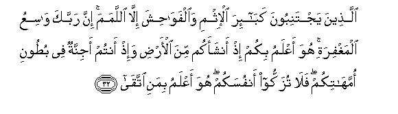 32. Allatheena yajtaniboona kaba-ira al-ithmi waalfawahisha illa allamama inna rabbaka wasiAAu almaghfirati huwa aAAlamu bikum ith anshaakum mina al-ardi wa-ith antum ajinnatun fee butooni ommahatikum fala tuzakkoo anfusakum huwa aAAlamu bimani ittaqa