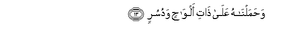 13. But We bore him on an (Ark) made of broad planks and caulked with palm- fibre: