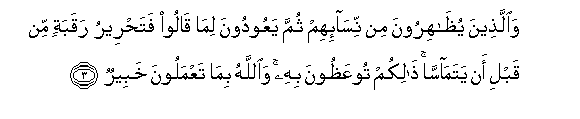 3. Waallatheena yuthahiroona min nisa-ihim thumma yaAAoodoona lima qaloo fatahreeru raqabatin min qabli an yatamassa thalikum tooAAathoona bihi waAllahu bima taAAmaloona khabeerun