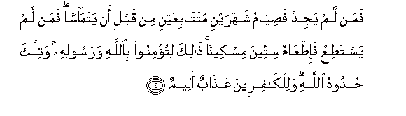 4. Faman lam yajid fasiyamu shahrayni mutatabiAAayni min qabli an yatamassa faman lam yastatiAA fa-itAAamu sitteena miskeenan thalika litu/minoo biAllahi warasoolihi watilka hudoodu Allahi walilkafireena AAathabun aleemun