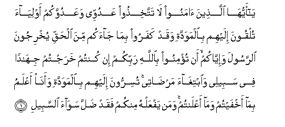 1. Ya ayyuha allatheena amanoo la tattakhithoo AAaduwwee waAAaduwwakum awliyaa tulqoona ilayhim bialmawaddati waqad kafaroo bima jaakum mina alhaqqi yukhrijoona alrrasoola wa-iyyakum an tu/minoo biAllahi rabbikum in kuntum kharajtum jihadan fee sabeelee waibtighaa mardatee tusirroona ilayhim bialmawaddati waana aAAlamu bima akhfaytum wama aAAlantum waman yafAAalhu minkum faqad dalla sawaa alssabeeli