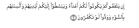 2. In yathqafookum yakoonoo lakam aAAdaan wayabsutoo ilaykum aydiyahum waalsinatahum bialssoo-i wawaddoo law takfuroona