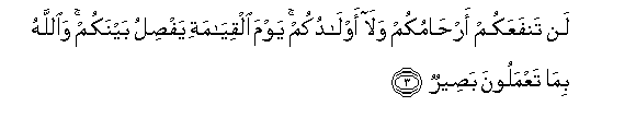 3. Lan tanfaAAakum arhamukum wala awladukum yawma alqiyamati yafsilu baynakum waAllahu bima taAAmaloona baseerun
