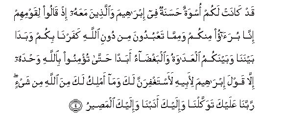 4. Qad kanat lakum oswatun hasanatun fee ibraheema waallatheena maAAahu ith qaloo liqawmihim inna buraao minkum wamimma taAAbudoona min dooni Allahi kafarna bikum wabada baynana wabaynakumu alAAadawatu waalbaghdao abadan hatta tu/minoo biAllahi wahdahu illa qawla ibraheema li-abeehi laastaghfiranna laka wama amliku laka mina Allahi min shay-in rabbana AAalayka tawakkalna wa-ilayka anabna wa-ilayka almaseeru