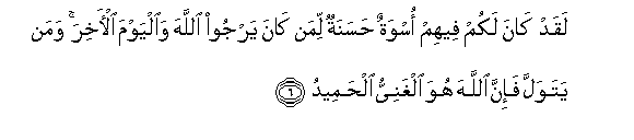 6. Laqad kana lakum feehim oswatun hasanatun liman kana yarjoo Allaha waalyawma al-akhira waman yatawalla fa-inna Allaha huwa alghanniyyu alhameedu