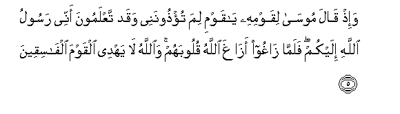 5. Wa-ith qala moosa liqawmihi ya qawmi lima tu/thoonanee waqad taAAlamoona annee rasoolu Allahi ilaykum falamma zaghoo azagha Allahu quloobahum waAllahu la yahdee alqawma alfasiqeena