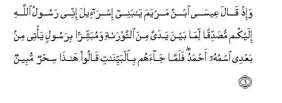 6. Wa-ith qala AAeesa ibnu maryama ya banee isra-eela innee rasoolu Allahi ilaykum musaddiqan lima bayna yadayya mina alttawrati wamubashshiran birasoolin ya/tee min baAAdee ismuhu ahmadu falamma jaahum bialbayyinati qaloo hatha sihrun mubeenun