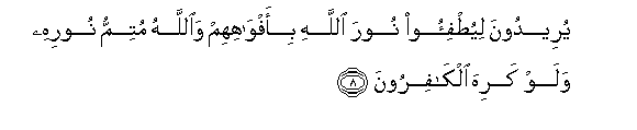 8. Yureedoona liyutfi-oo noora Allahi bi-afwahihim waAllahu mutimmu noorihi walaw kariha alkafiroona